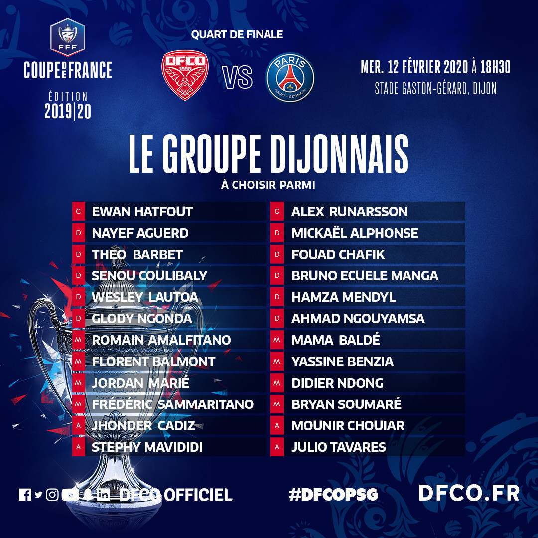 Pour le compte des quarts de finale de la coupe de France, le DFCO affrontera le PSG mercredi (18h30) au stade Gaston-Gérard. Stéphane Jobard et son staff ont communiqué un groupe de 24 joueurs.