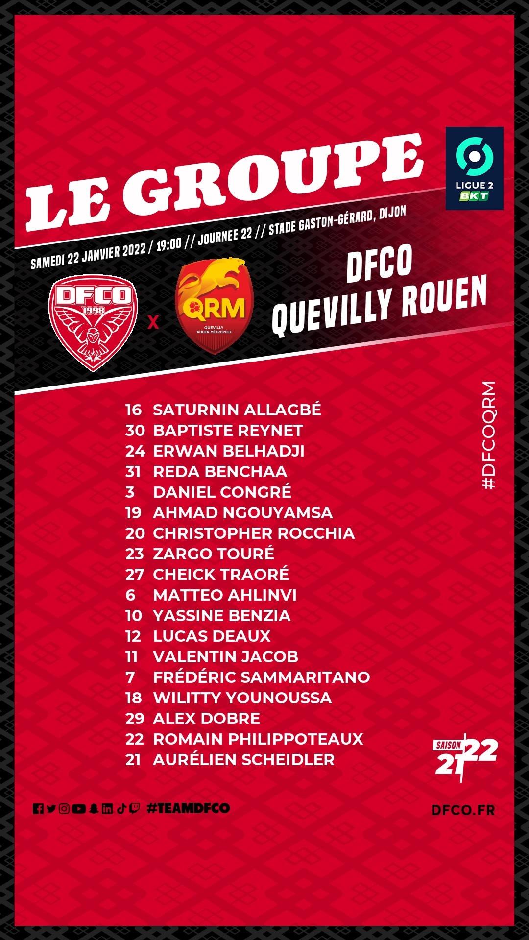Ce samedi 22 janvier (19h00), le DFCO affronte Quevilly/Rouen pour le compte de la 22e journée de Ligue 2 BKT. 18 joueurs ont été convoqués par Patrice Garande et son staff.