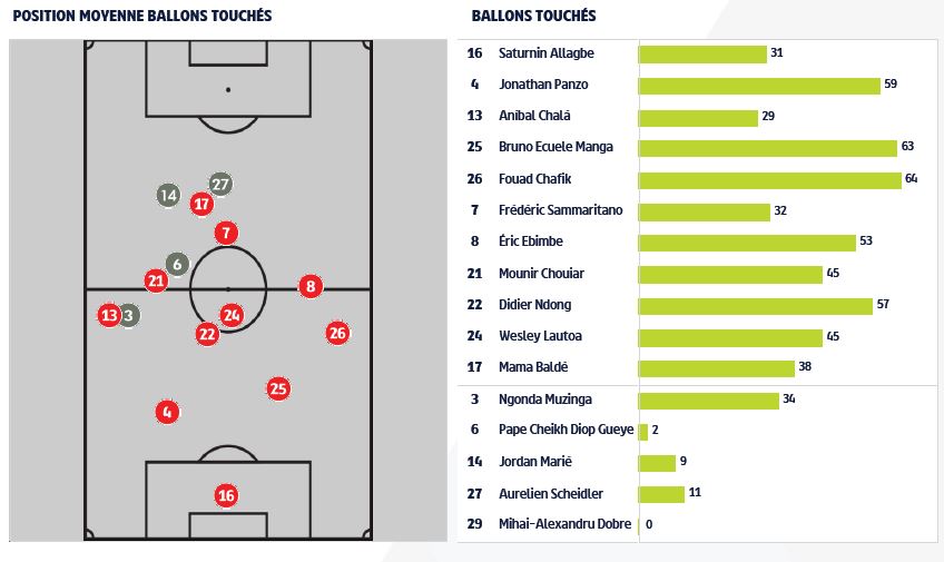 - Fouad Chafik est le Dijonnais qui a le plus touché de ballons durant ce match, juste devant Bruno Ecuele Manga (63) et Jonathan Panzo (59). Éric Junior Dina Ebimbe est l'élément offensif ayant le plus touché de ballon (53).