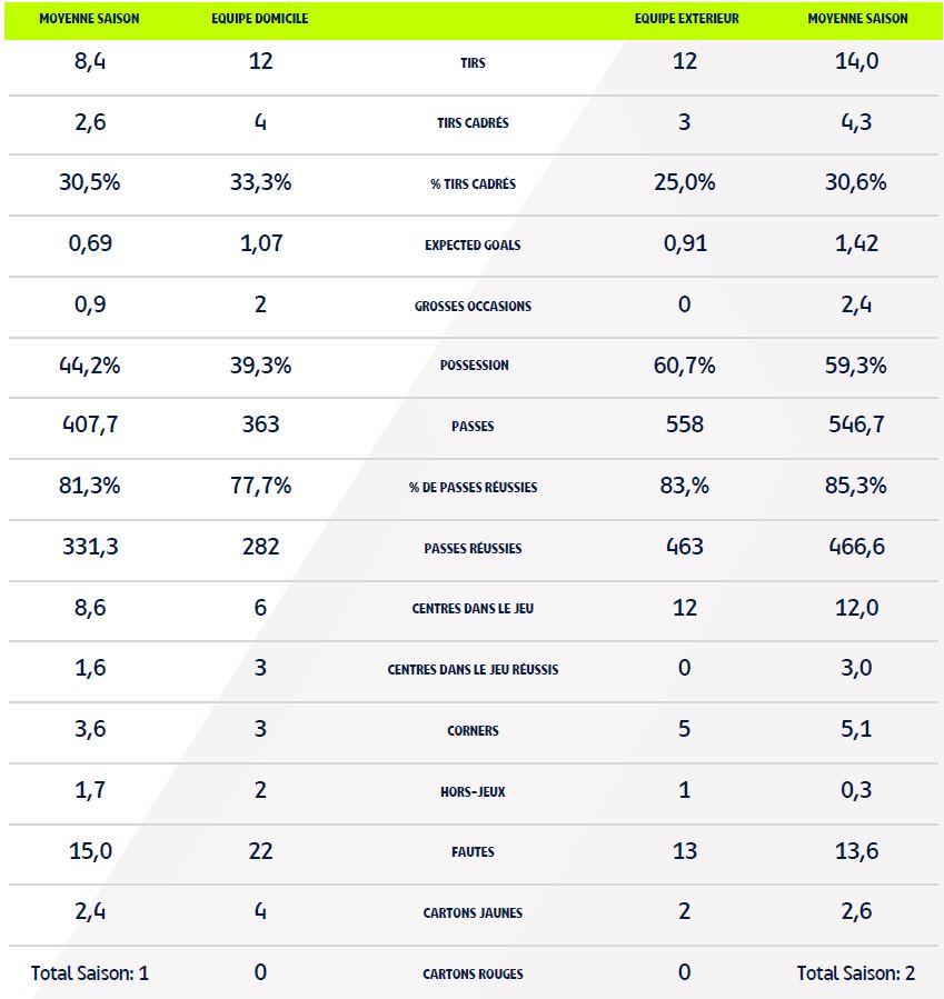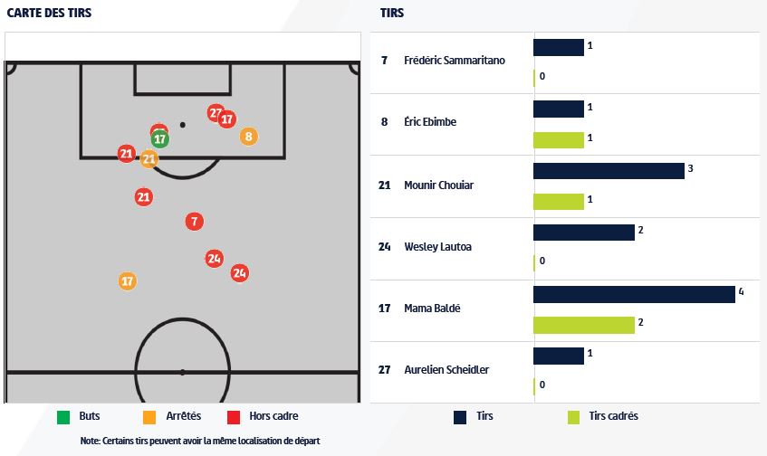 - Auteur du but dijonnais, Mama Baldé a tenté 4 frappes, dont 2 cadrées. L'attaquant a débloqué son compteur buts. Mounir Chouiar a lui délivré sa première passe décisive.