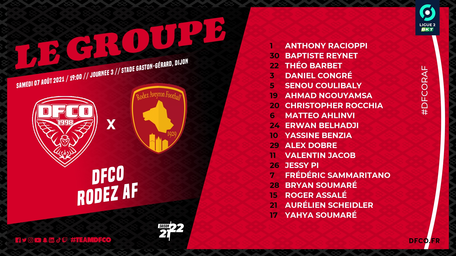 Pour la réception de Rodez samedi au stade Gaston-Gérard (19h00), David Linarès et son staff ont convoqué un groupe de 18 joueurs.