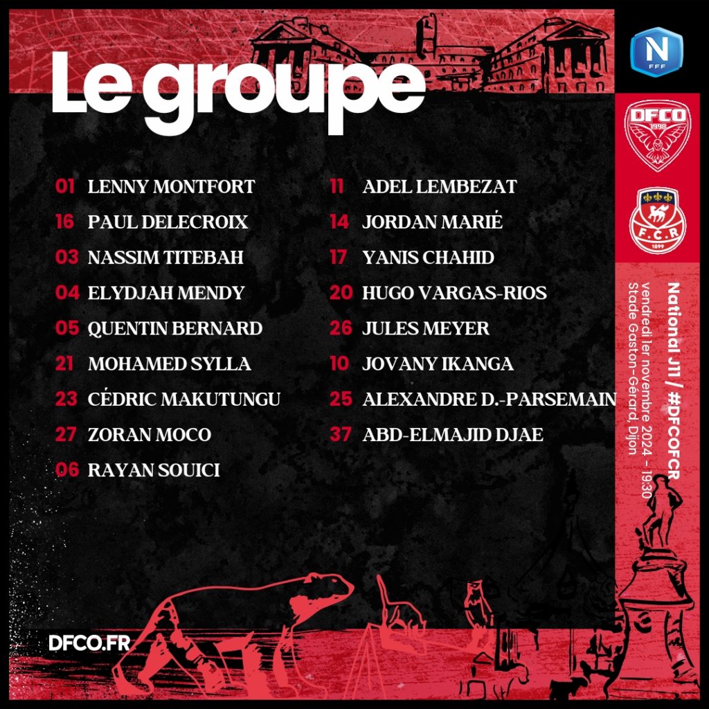 Pour le compte de la 11e journée de National, le DFCO recevra le FC Rouen ce vendredi 1er novembre (19h30). Pour ce match, 17 joueurs ont été convoqués par Baptiste Ridira et son staff.
