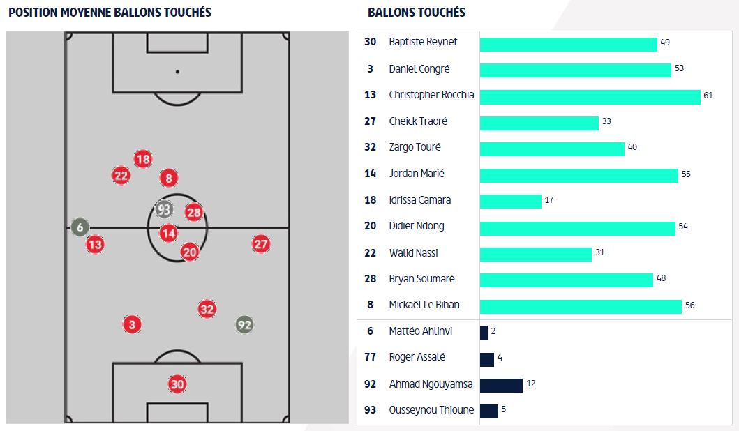 - Le défenseur stéphanois Anthony Briançon est le joueur qui a touché le plus de ballons au cours de cette partie (111), suivi de Jimmy Giraudon (77) et de Mickaël Nadé (71). Côté dijonnais, c’est Christopher Rocchia avec 61 ballons. Preuve de son énorme activité, Mickaël Le Bihan a touché 56 ballons, joli total pour un attaquant.