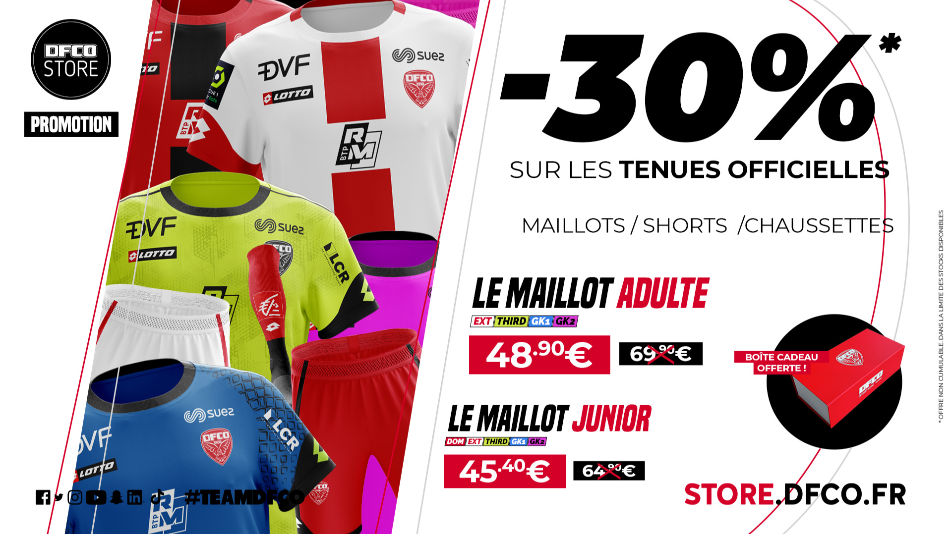 Profitez actuellement de -30 % de réduction sur les tenues officielles (maillots, shorts, chaussettes) ! Petit bonus sympa, le DFCO Store vous offre une superbe boîte cadeau !