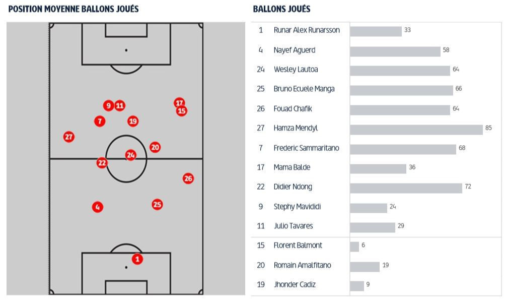 - Hamza Mendyl est le joueur qui a touché le plus de ballons lors de cette rencontre (85). Il a réussi 21 passes dans le derniers tiers adverse. Didier Ndong a touché 72 ballons, Frédéric Sammaritano 68.