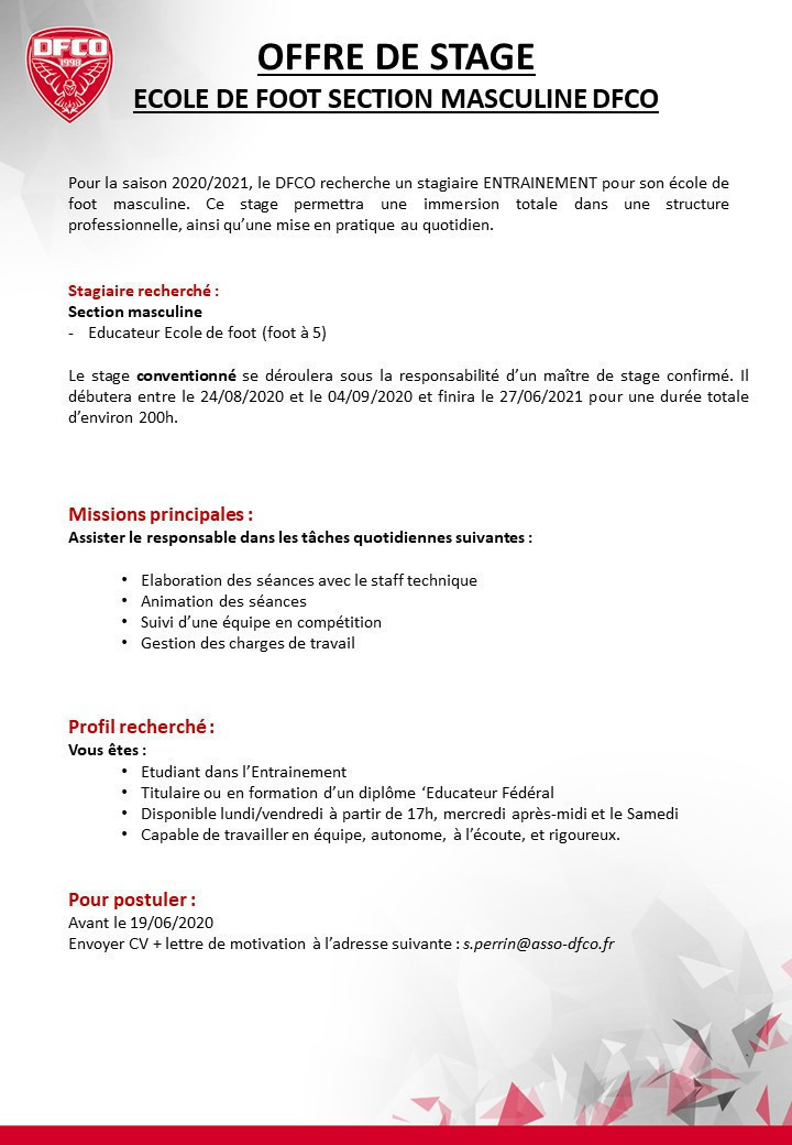 En prévision de la nouvelle saison, le DFCO recherche un stagiaire entrainement pour son école de foot masculine. Toutes les informations ci-dessous.