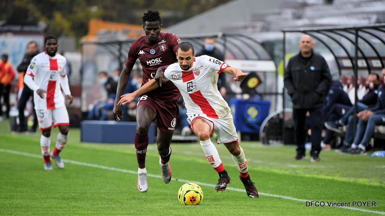 Les Grenats vont se reprendre le jeu à leur compte durant une dizaine de minutes, mais c’est encore le DFCO qui se signale par deux énormes occasions. Sur un centre de Glody Ngonda, Moussa Konaté place une tête décroisée qui va heurter le poteau gauche (83’). Sur l’action suivante, Bersant Celina trouve Mounir Chouiar dont la demi-volée passe de peu à côté (84’). La fin de match est indécise et chaque équipe aura sa balle de match ! Anthony Racioppi réalise l’arrêt qu’il faut sur une demi-volée d’Ambrose (87’), puis c’est Bruno Ecuele Manga qui a réalisé un superbe sauvetage devant Leya Iseka (89’). Dans le temps additionnel, le DFCO croit pouvoir obtenir un penalty sur une main messine, mais l’arbitre ne bronche pas, puis Oukidja reste solide sur une tête de Bruno Ecuele Manga.