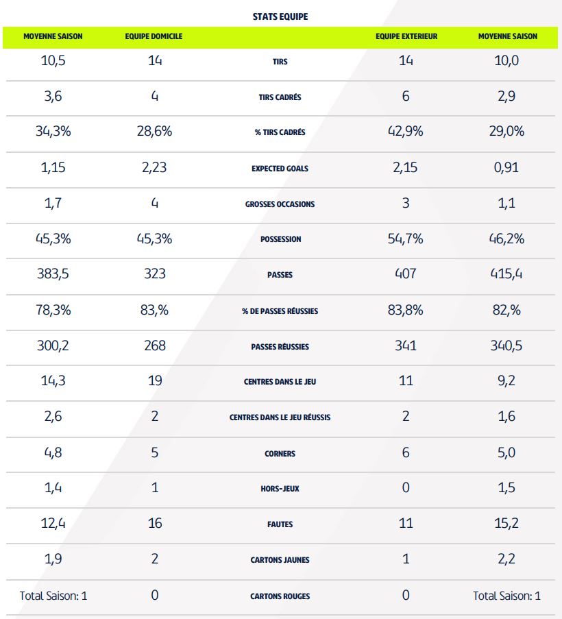 - Mounir Chouiar est le joueur qui a le plus tenté de frappes (5 dont 3 cadrées) durant cette rencontre, devant Moussa Konaté (3) et Mama Baldé (3). C'est également Mounir Chouiar qui a délivré le plus de passes donnant lieu à un tir (4).