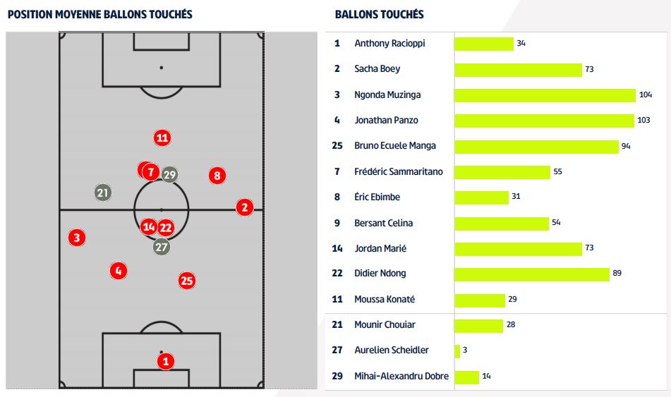 - Avec une possession largement supérieure, pas étonnant de retrouver des Dijonnais sur le podium des joueurs ayant touché le plus de ballons. Ainsi, Glody Ngonda (104 ballons), Jonathan Panzo (103) et Bruno Ecuele Manga (94) sont en tête. Suivis des deux milieux défensifs Didier Ndong (89) et Jordan Marié (73). Le premier Nantais, Sébastien Corchia, a touché 57 ballons.