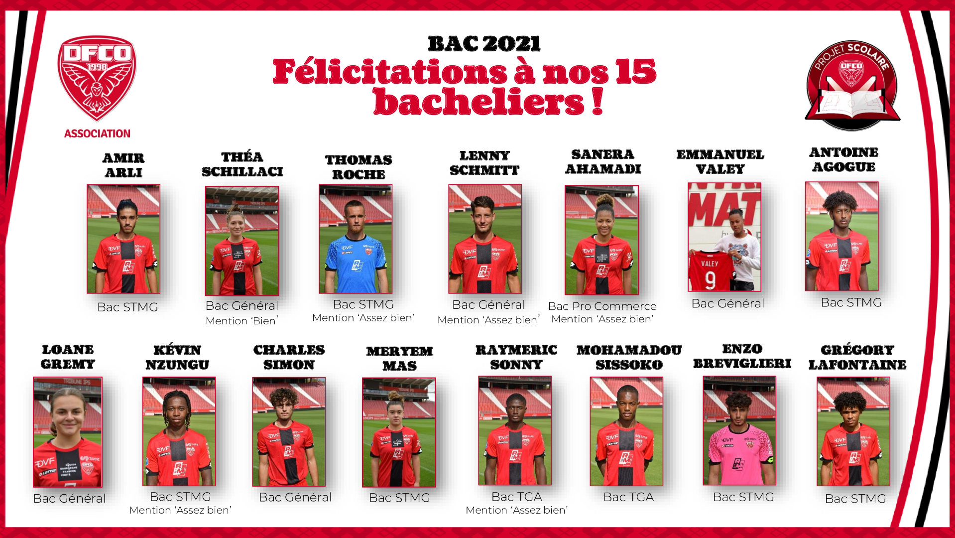 Quinze joueurs et joueuses du DFCO ont validé leur baccalauréat. Merci aux lycées des Arcades et d"Hippolyte Fontaine.