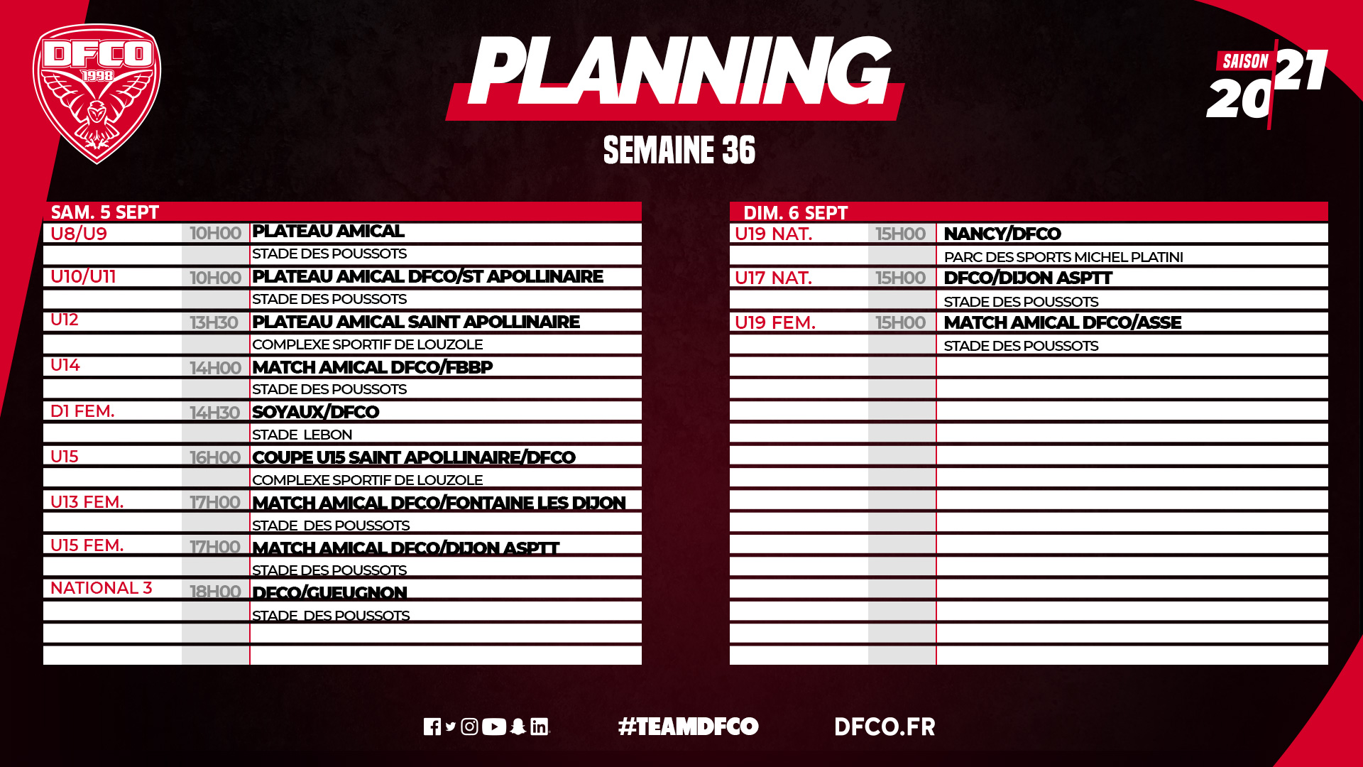 Retrouvez le planning des équipes de l"association DFCO et des féminines pour ce week-end du 5 et 6 septembre. Première journée de championnat pour nos U17 Nationaux et notre D1 Féminine.