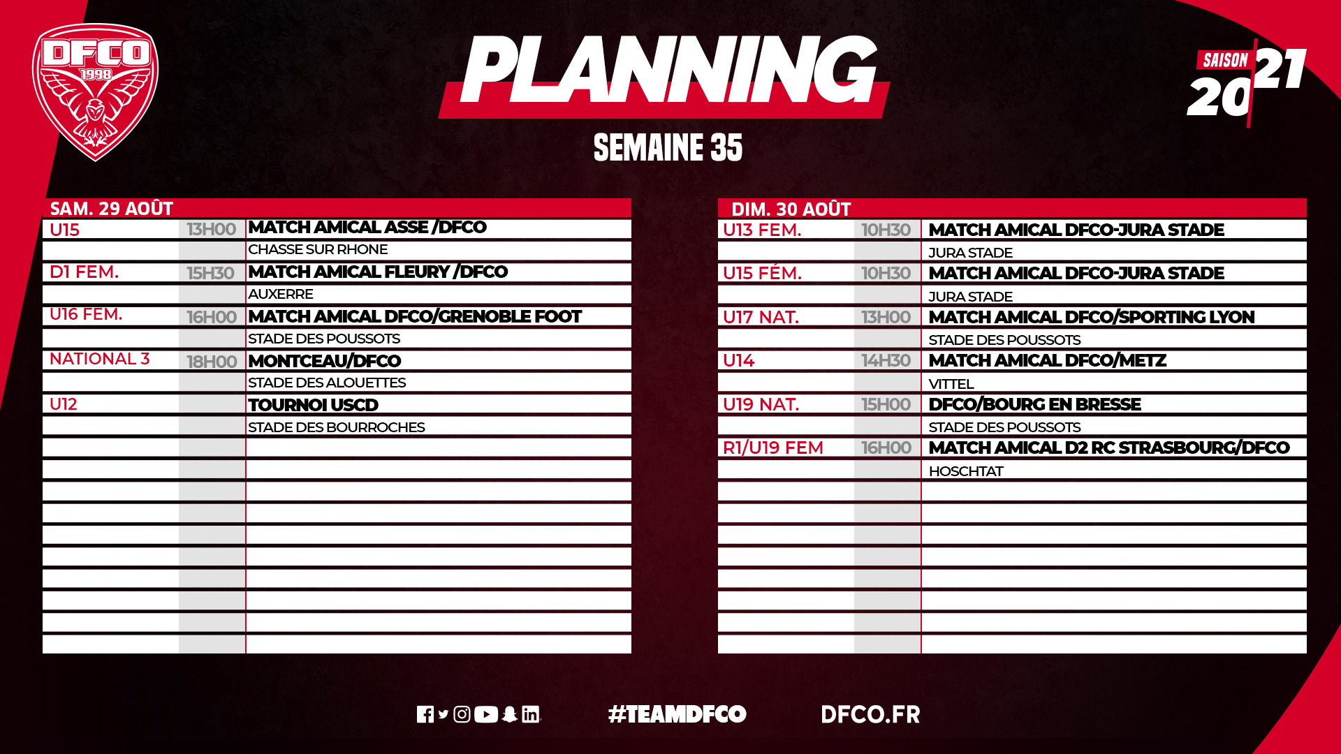 Retrouvez le planning du week-end des équipes de l'association DFCO et des féminines pour le week-end prochain. Première journée de championnat pour notre N3 et nos U19 Nationaux.