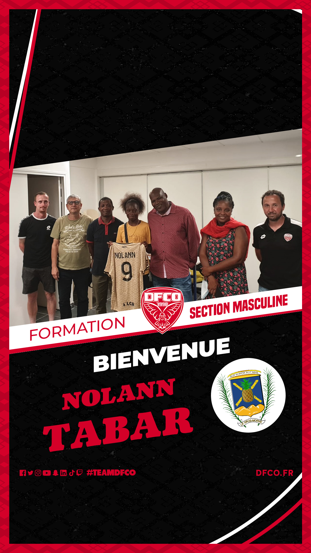 Nolann, attaquant licencié au François Foot, originaire de la commune du Gros-Morne, a accepté le projet de formation du Dijon FCO, entouré de sa famille, des élus de la Ville du Gros-Morne, en présence de Cédric Cottet, Daniel Fezeu, éducateurs et Thomas Fabre, responsable du recrutement.