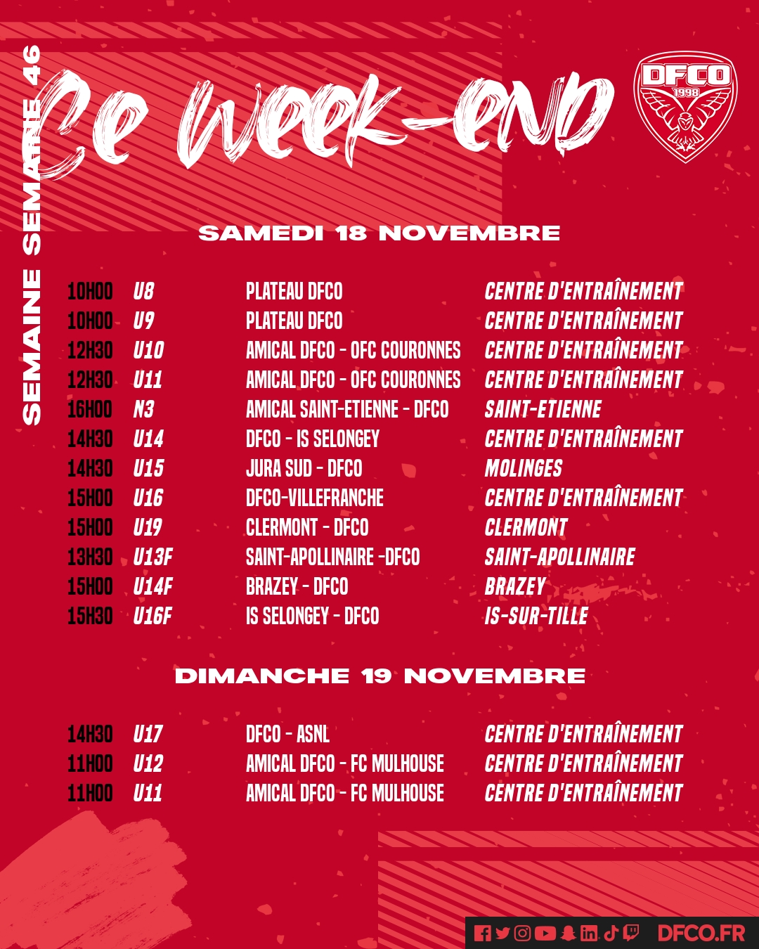 Nos jeunes de l’école de foot (U8-U9) prendront part à des plateaux samedi matin avec les équipes de l’Asptt, Longvic, Gueugnon, FDFC, Auxerre. Les U10 et U11 affronteront l’OFC Couronnes en amical. Les U19 se déplaceront à Clermont.