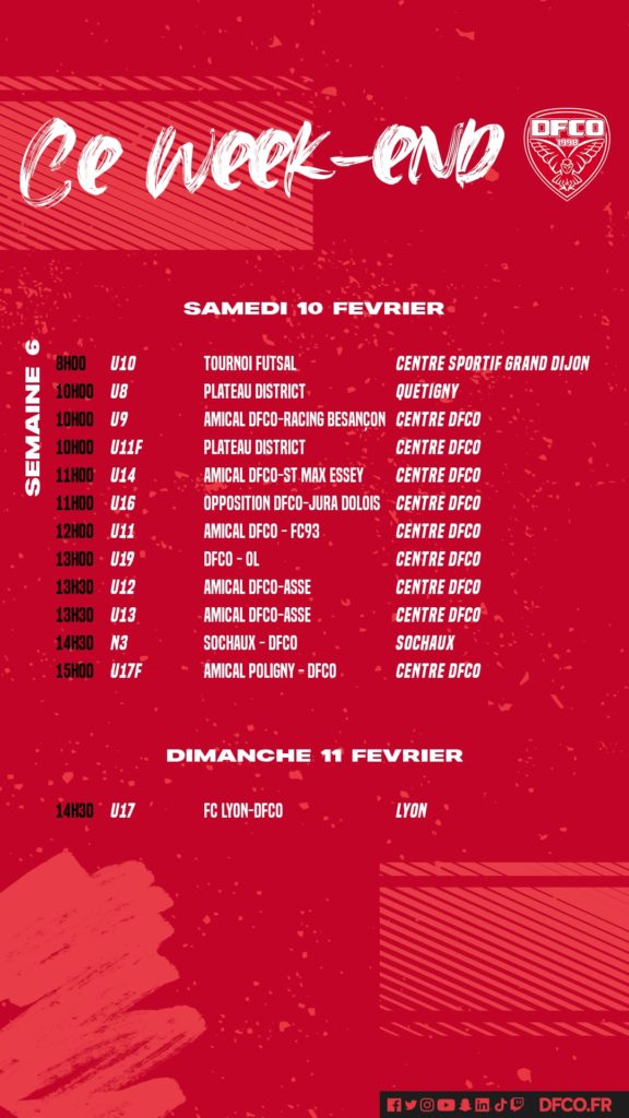 Les U19 reçoivent samedi à 13h l’Olympique Lyonnais et la N3 se déplace à 14h30 à Sochaux. Dimanche, les U17 se rendront à Lyon pour affronter le FC Lyon à 14h30.
