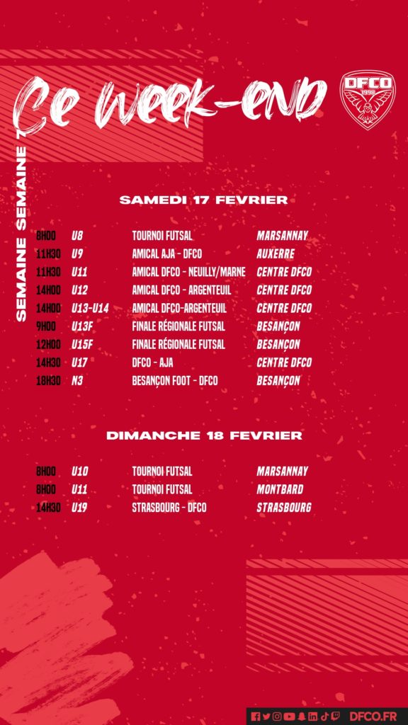 Les U17 recevront l’AJA samedi à 14h30 sur les terrains du centre d’entraînement de Saint-Apollinaire. La N3 sera en déplacement ce même jour du côté de Besançon (coup d’envoi 18h00). Les U19 se déplaceront à Strasbourg dimanche (coup d’envoi 14h30).