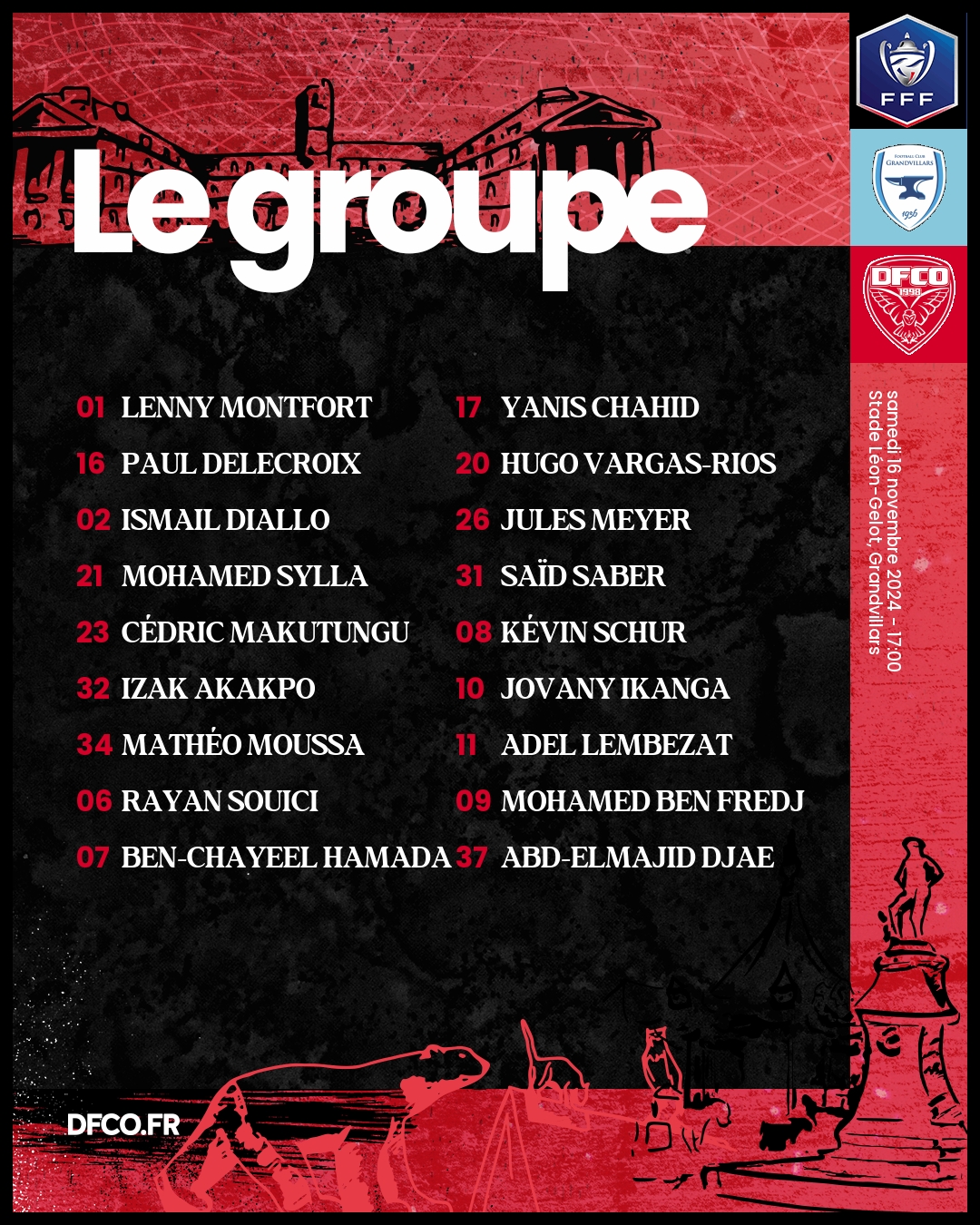 Pour le compte du 7ème Tour de Coupe de France, le DFCO se déplacera ce samedi (17h) sur la pelouse de Grandvillars. Baptiste Ridira et son staff ont composé un groupe de 18 joueurs.