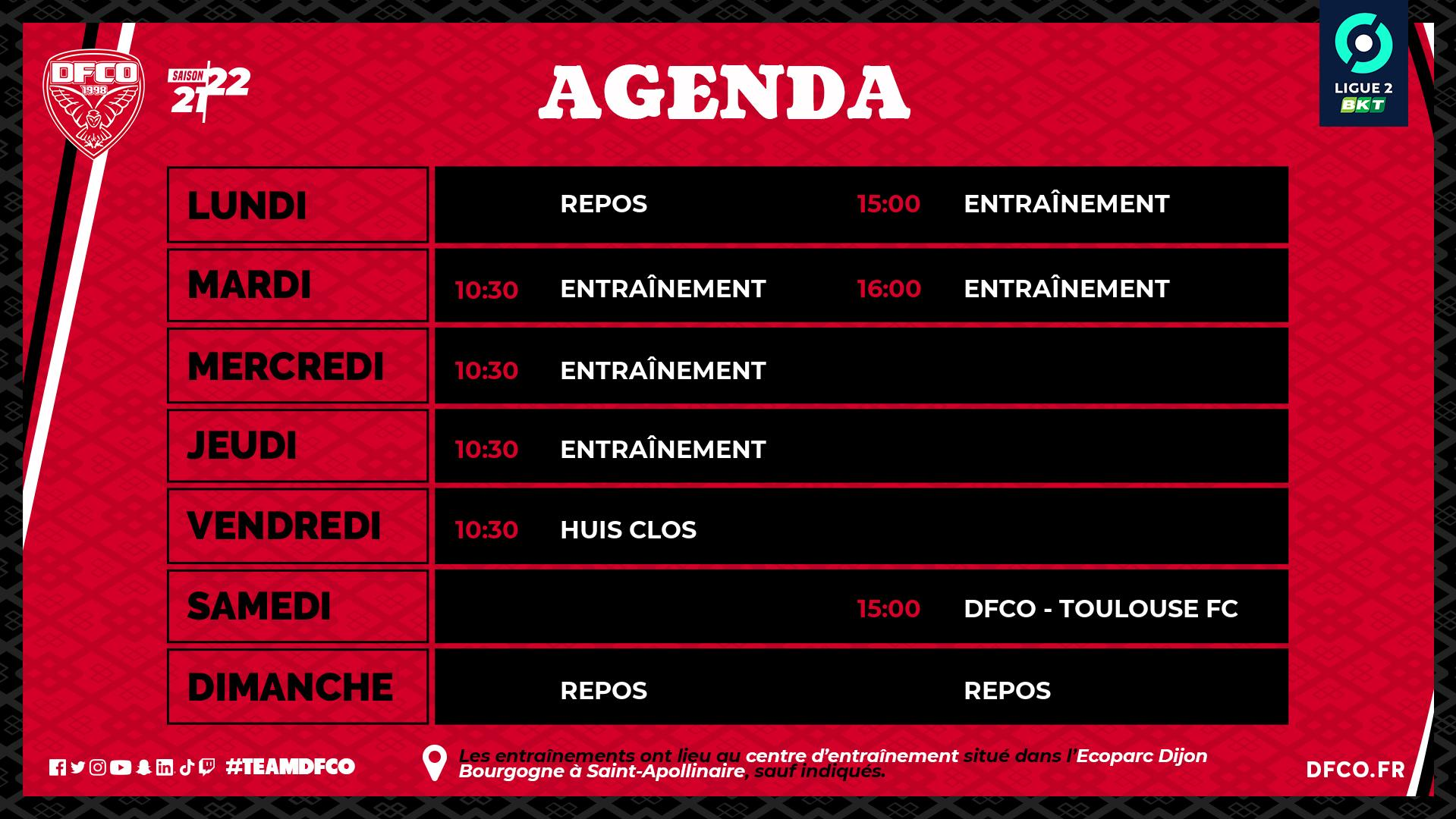 Voici le planning de la semaine d"entraînement du groupe professionnel avant de défier le Toulouse FC au stade Gaston-Gérard samedi (15h00) pour le compte de la 5e journée de Ligue 2 BKT.
