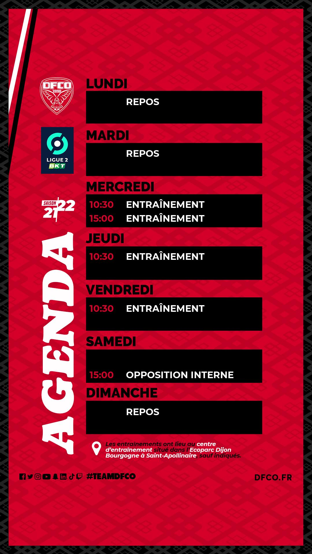 Pas de rencontre officielle cette semaine pour le groupe professionnel. La reprise de l'entraînement est programmée mercredi matin. Les joueurs blessés seront en soins mardi après-midi.
