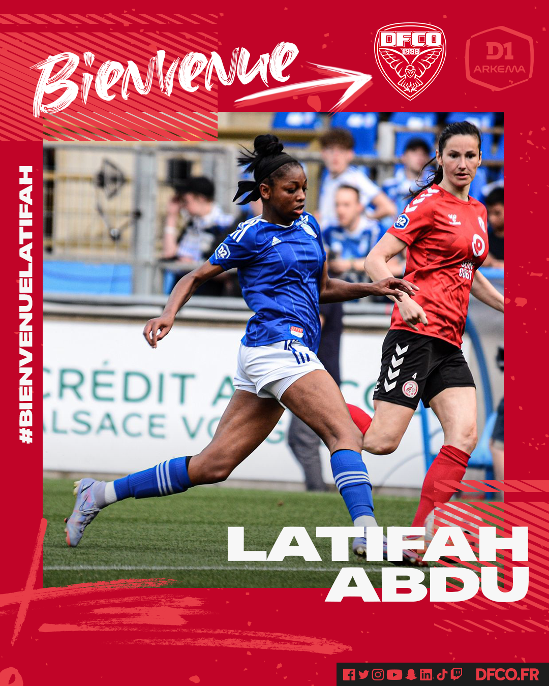 Le DFCO a le plaisir d’officialiser la signature de Latifah Abdu pour une durée de 2 ans. Cette jeune attaquante de 22 ans arrive en provenance de Strasbourg.