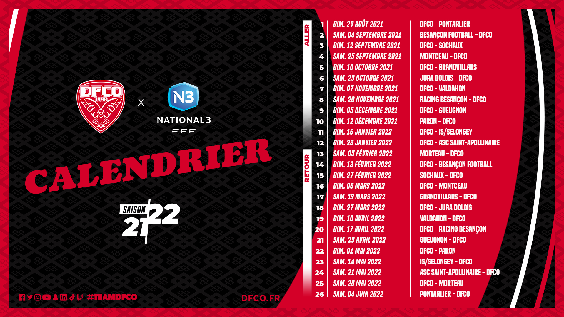 La FFF a rendu publique le calendrier 21/22 de National 3. Le DFCO B recevra Pontarlier lors de la première journée le week-end du 29 août.