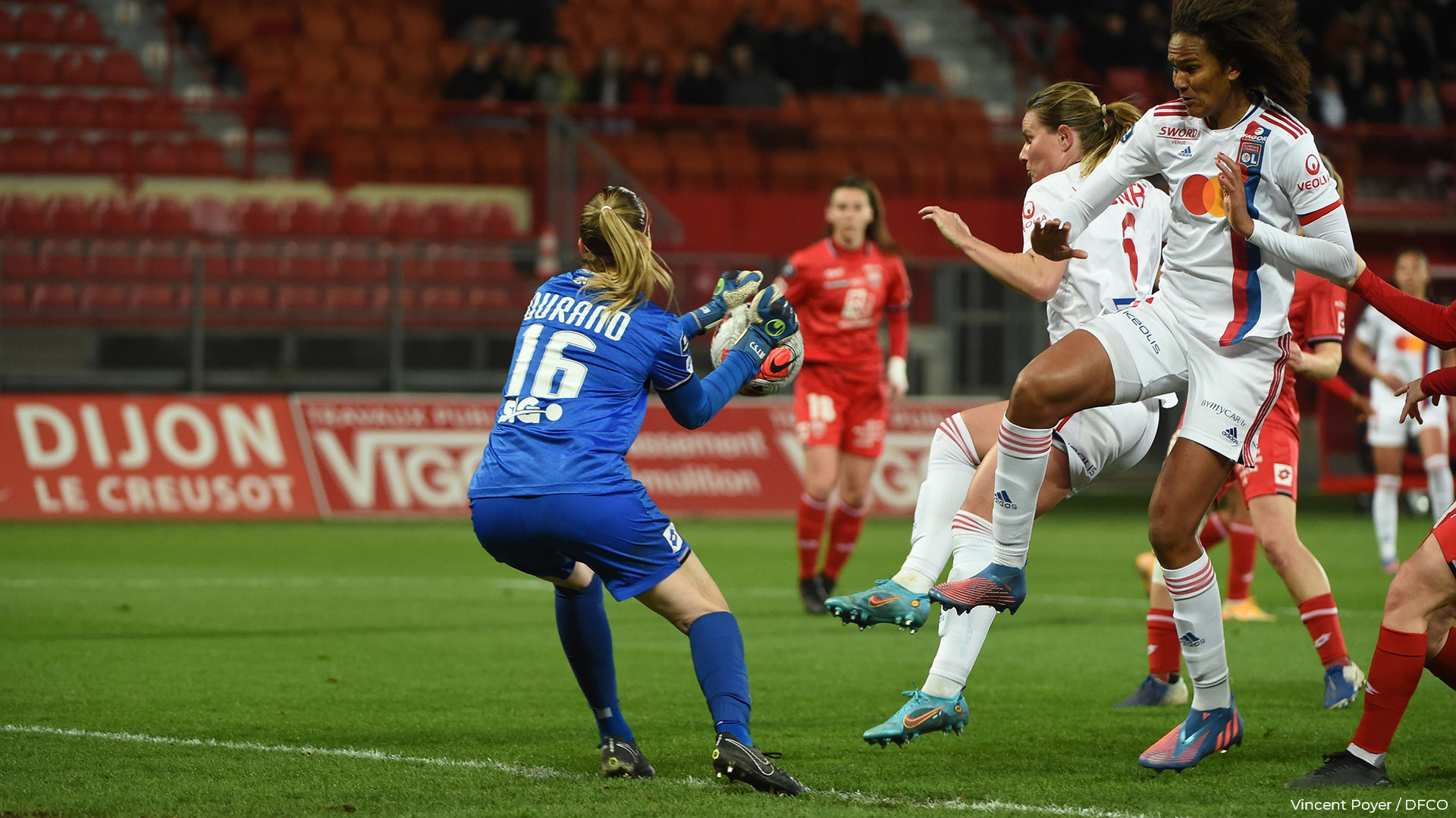 Le DFCO fait de son mieux pour contenir les assauts lyonnais. Il tremble quand même lorsque Solène Durand écarte le danger des deux poings et que le ballon retombe sur MBock, dont le lob en première intention flirte avec le poteau (21′).