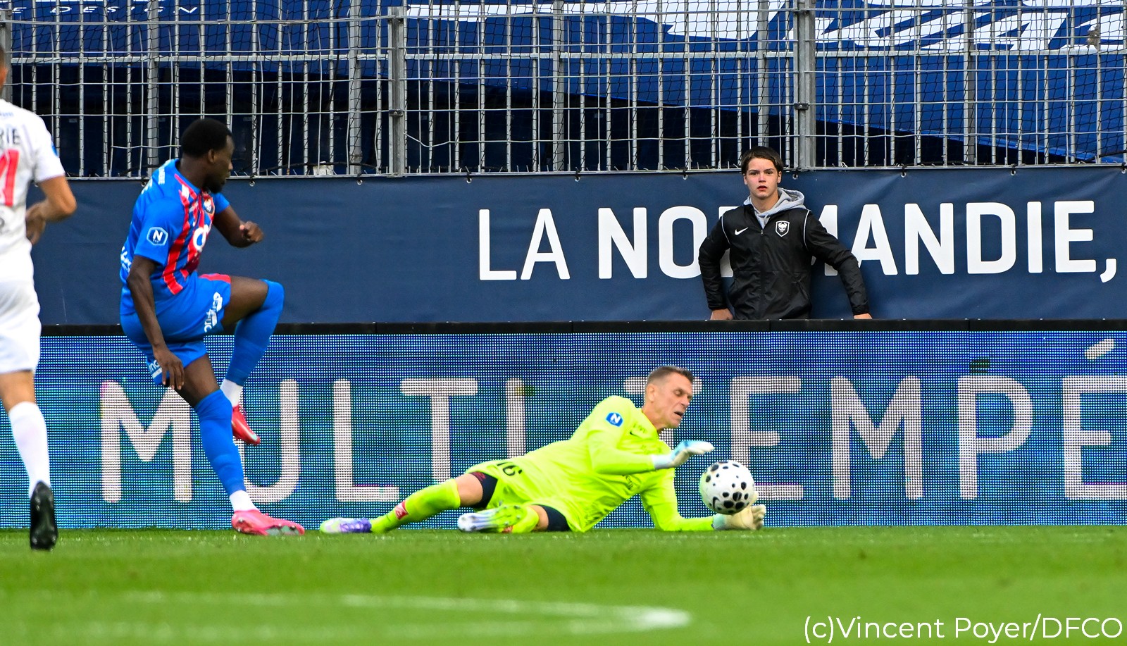 D’entrée de jeu, le SM Caen a l’occasion de surprendre les dijonnais, mais c’était sans compter sur l’intervention clinique de Paul Delecroix venu au duel devant Adama Diakité (4’).