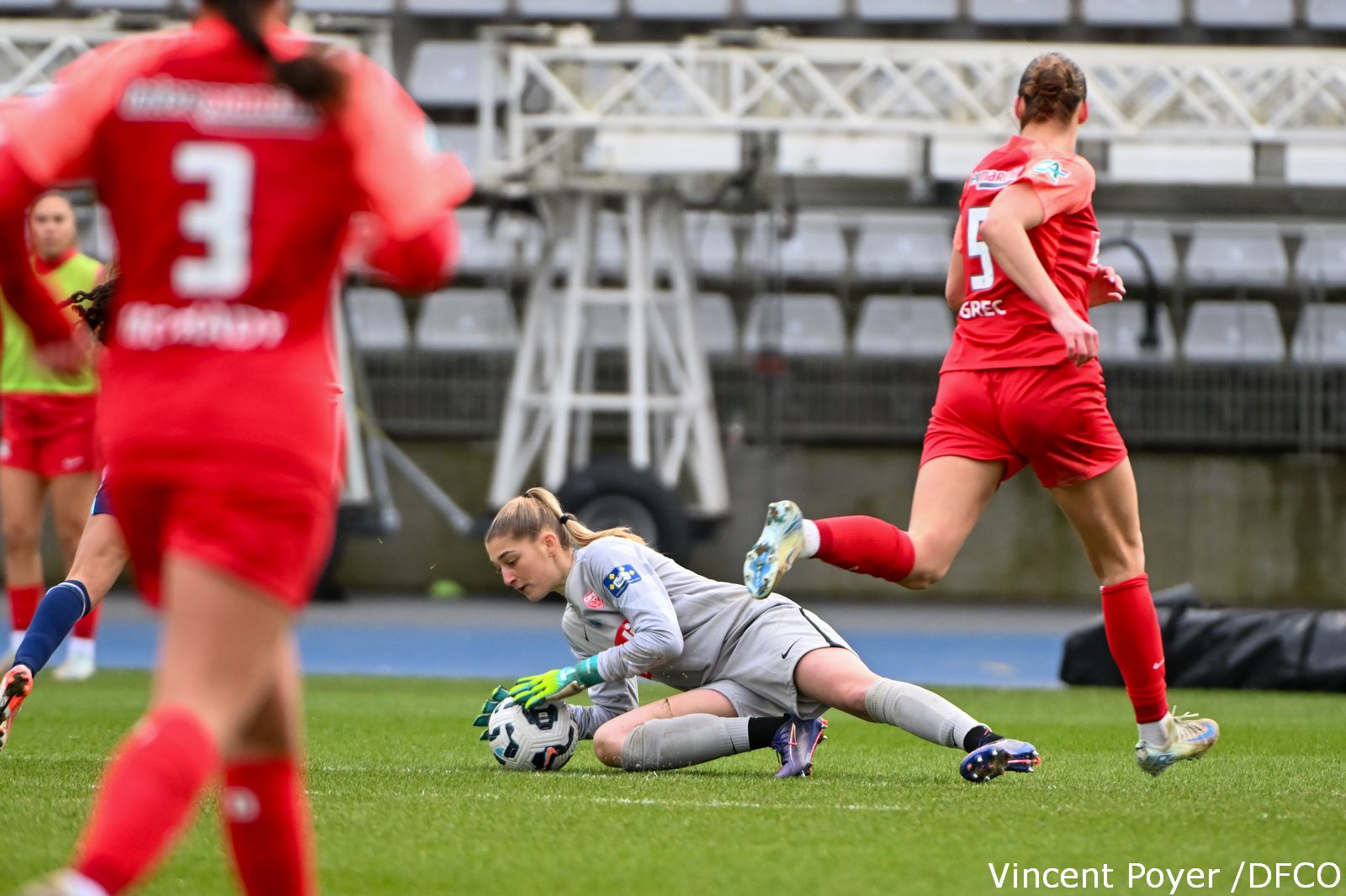 La gardienne dijonnaise réalise cependant une première mi-temps de haute volée. Au quart d’heure de jeu, elle intervient fort à propos dans les pieds de Clara Matéo (14′).