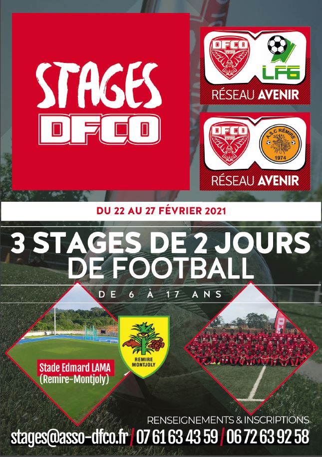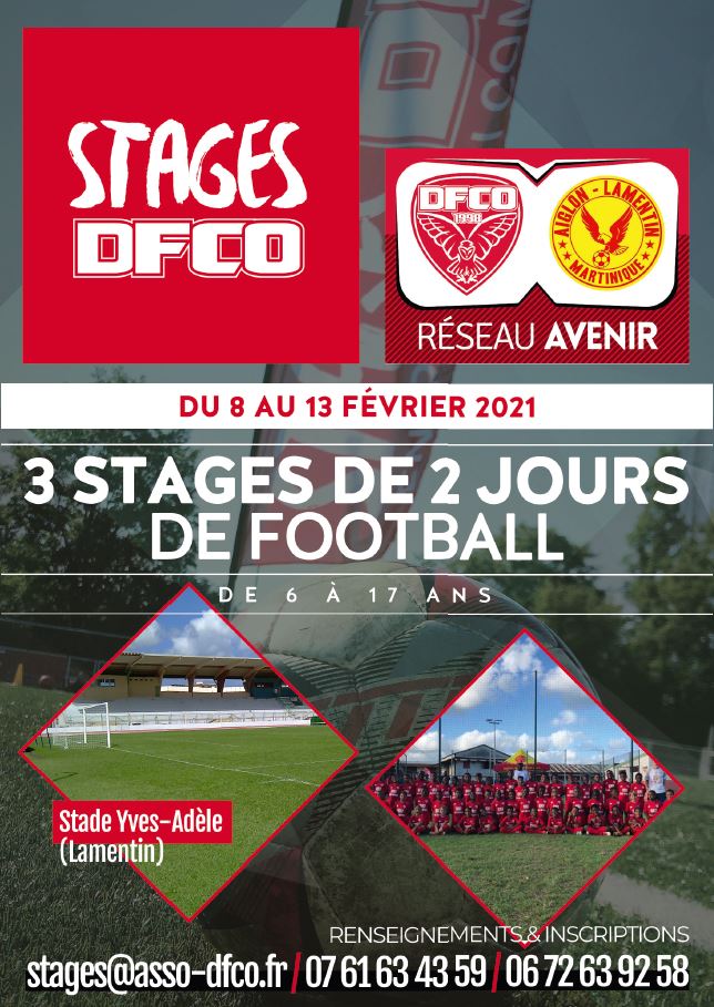 Le DFCO propose 3 stages de deux jours du 8 au 13 février au Lamentin, en Martinique. Puis de nouveau 3 stages de deux jours du 22 au 27 février à Remire-Montjoly en Guyane. Ces stages sont proposés à des joueuses et des joueurs âgés de 6 à 17 ans.