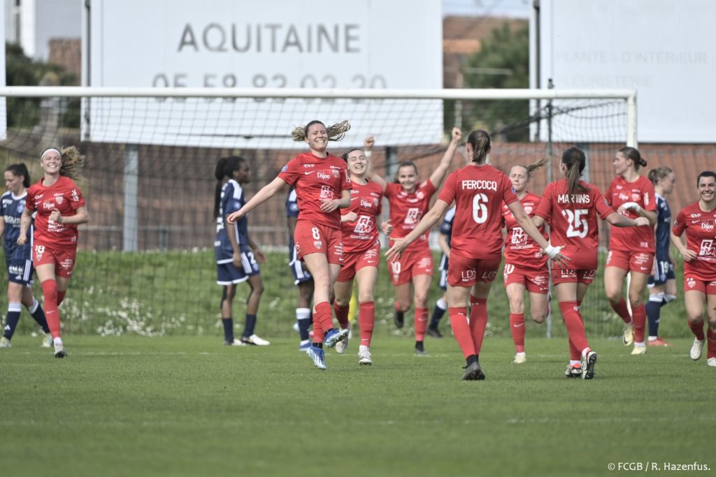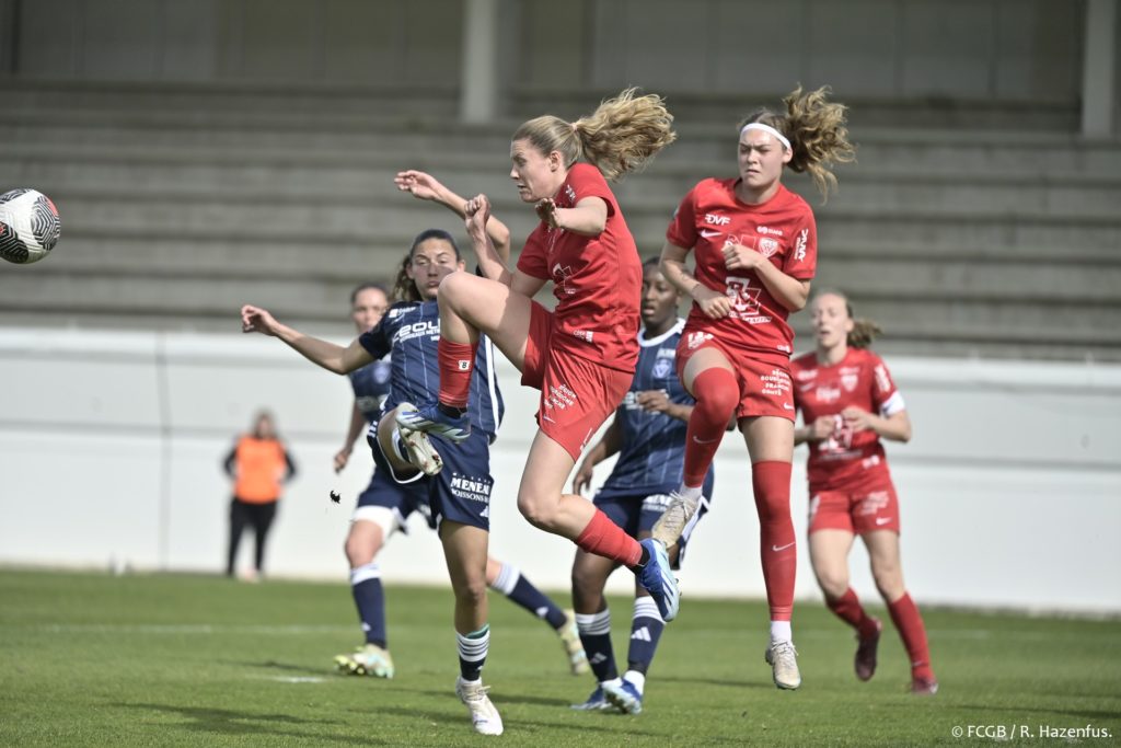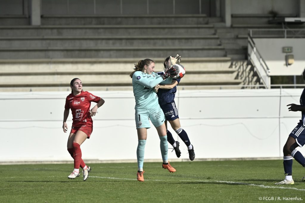 Face à la lanterne rouge du classement, les dijonnaises se sont montrées sérieuses, constantes et solides dans le jeu. La première occasion est à mettre à l’actif des bordelaises plutôt remuantes lors des vingt premières minutes. Sur un corner rentrant de la capitaine bordelaise Laura Bourgouin, Lisa Lichtfus s’interpose (17′). Les dijonnaises bien en place, cherchent les espaces et se rapprochent du but gardé par Justine Lerond. L’ouverture du score viendra un peu avant la demi-heure de jeu sur un coup franc proche de la surface sur la gauche du but. Léa Declercq fait parler son coup de patte et inscrit un superbe coup franc dans la lucarne opposée (0-1, 29′). La milieu de terrain dijonnaise inscrit ici son troisième but de la saison. Quelques minutes plus tard, Bordeaux a l’opportunité d’égaliser mais Lisa Lichtfus veille et détourne sur sa barre une belle frappe de Fiona Liaigre (32′). Les débats sont équilibrés sur cette fin de période mais c’est le DFCO par l’intermédiaire de son attaquante polonaise Klaudia Jedlinska qui fait le break dans les arrêts de jeu (0-2, 45+2).