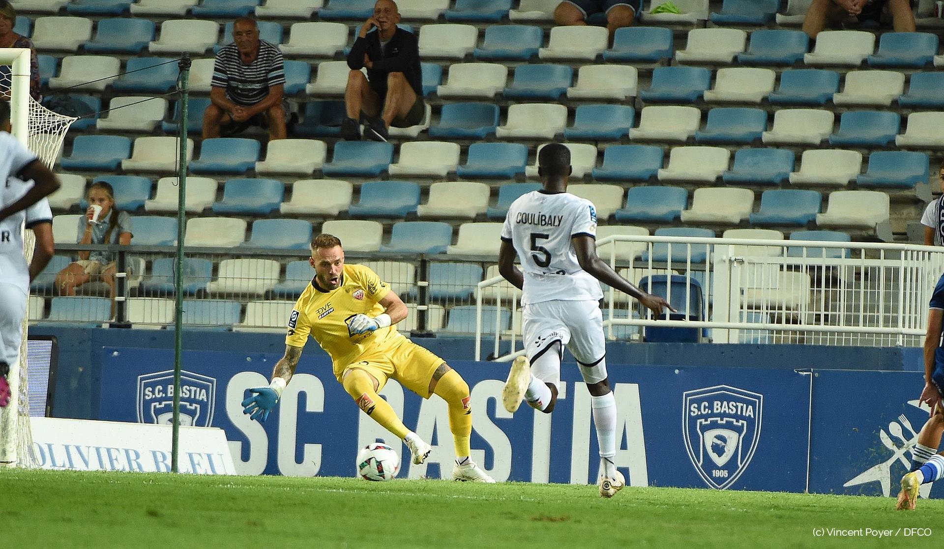 Au début de la seconde période, Loum Tchaouna a remplacé Jordan Marié, et le jeune transfuge de Rennes se met tout se suite en évidence. Lancé dans la profondeur, il est retenu par Kaiboué. M. Lepaysant fait preuve de clémence en n’adressant qu’un avertissement au Bastiais, car Tchaouna partait bien seul (49′). Cette petite promesse d’une meilleure deuxième période restera malheureusement sans réponse, car le DFCO ne parvient toujours pas à poser le jeu. En face, Bastia pousse timidement, mais se trompe régulièrement dans le dernier geste … jusqu’à ce que Migouel Alfarela soit trouvé par Van den Kerkhof dans la profondeur, à la limite du hors-jeu. L’ancien du Paris FC s’en va battre Baptiste Reynet en un contre un (1-0, 56′).