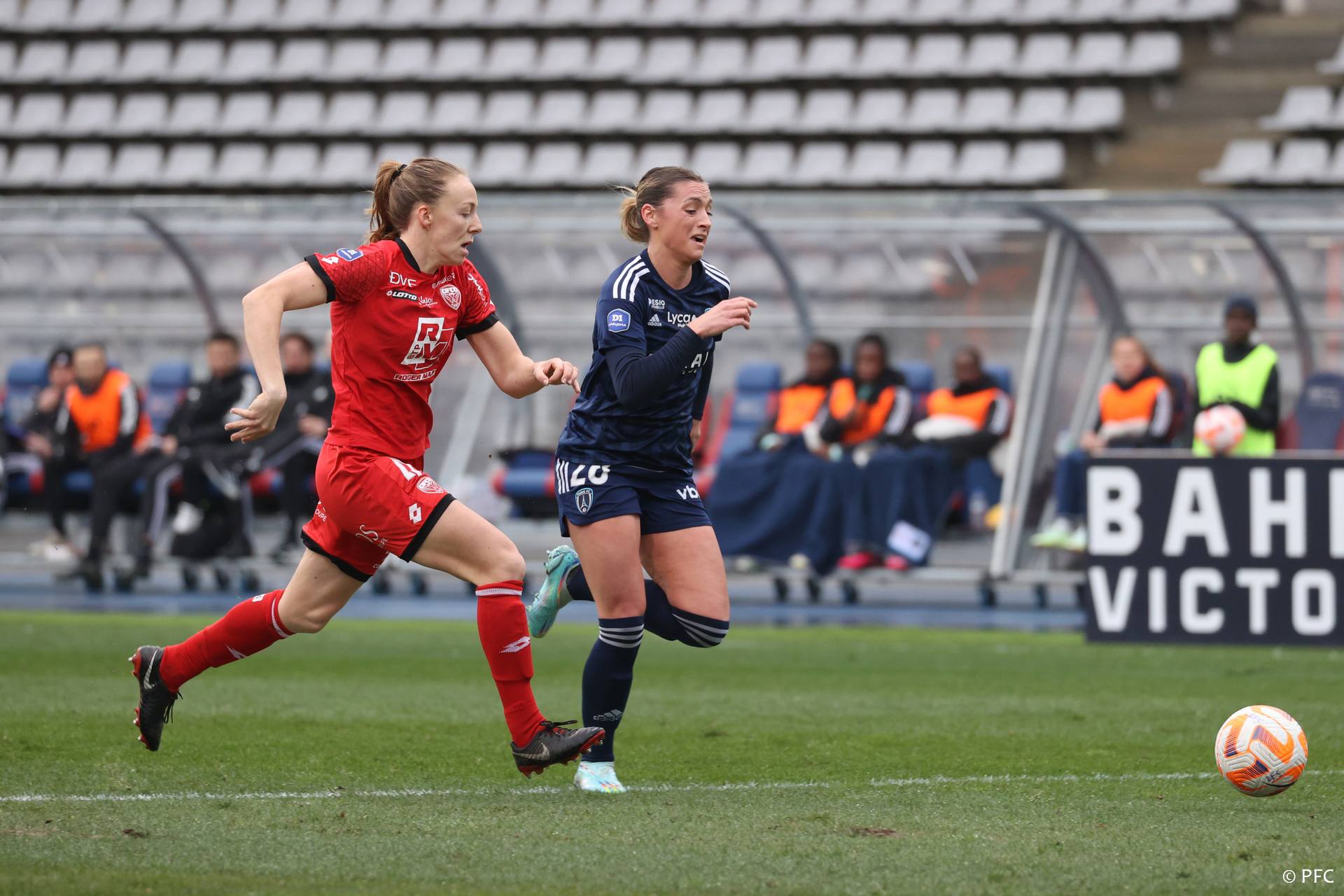 Sur une pelouse très compliquée, le début de match est à mettre à l’actif des parisiennes. La première grosse occasion survient à la 8ème minute pour le Paris FC. Sur une talonnade de Gaëtane Thiney, Clara Matéo décoche une frappe qui frôle le poteau de Lisa Lichtfus. Passée cette première grosse occasion et la domination parisienne du début de match, les dijonnaises s’enhardissent et les débats s’équilibrent. Le bloc dijonnais est bien en place et les Rouges procèdent en contre-attaques en appuyant notamment sur le côté droit de l’attaque. A la 21ème minute, la tête de Madeline Roth au premier poteau sur un centre de Léna Goetsch ne trouve malheureusement pas le cadre. Sept minutes plus tard, Jenna Hellstrom lancée en profondeur, centre dans la surface mais le ballon est intercepté par la gardienne du PFC. De son côté la défense dijonnaise bien en place veille.
