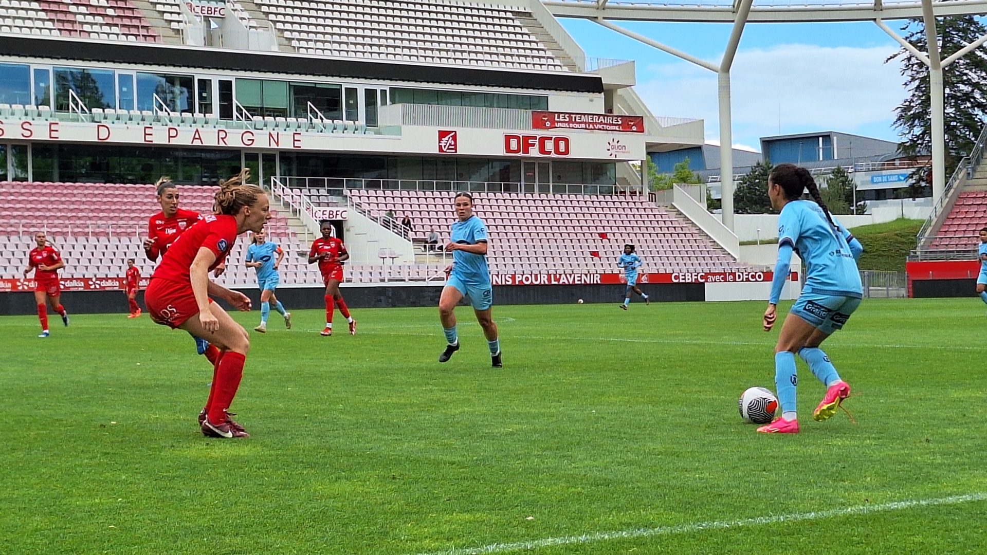 Si la première période est plutôt équilibrée, le DFCO se montrant dangereux par Klaudia Jedlinska puis Océane Picard, c’est bien Reims qui rentre aux vestiaires avec un avantage d’un but, une réalisation de Lou-Ann Joly (44′). Point noir de ce premier acte, la sortie sur blessure de Klaudia Jedlinska, touchée à la cheville, sans doute une entorse pour l’attaquante polonaise.