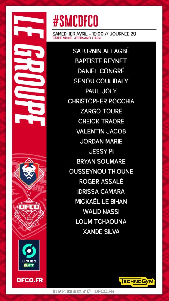 Pour le déplacement au stade d’Ornano samedi (19h00 / 29e journée de Ligue 2 BKT) face au Stade Malherbe de Caen, Omar Daf et son staff ont convoqué un groupe de 19 joueurs.