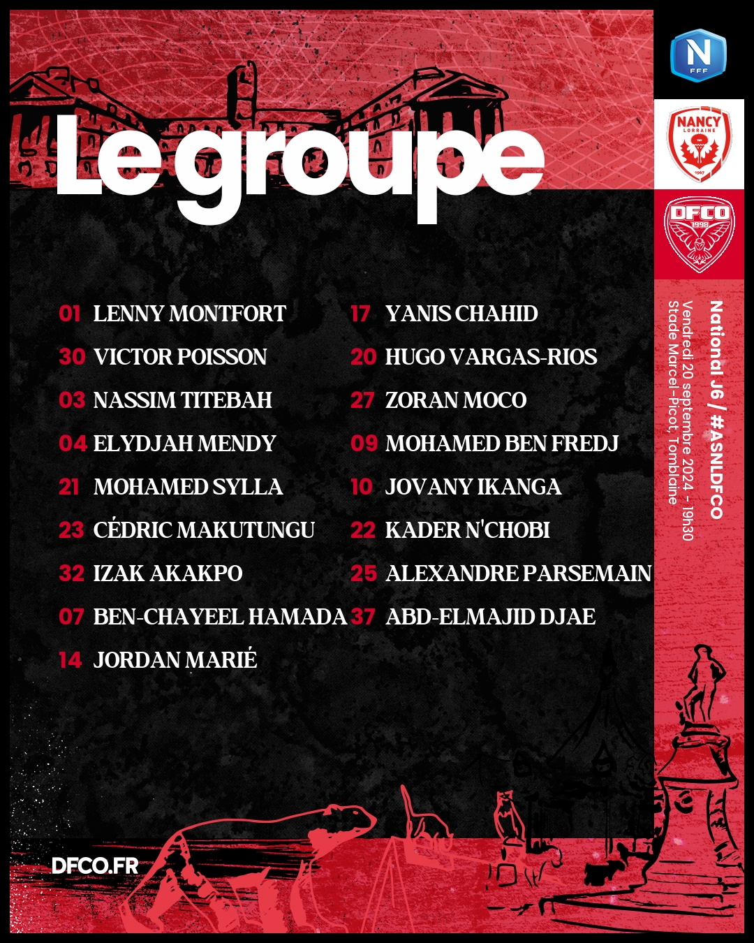 Pour le compte de la 6e journée de National, le DFCO se déplace sur la pelouse du stade Marcel-Picot pour affronter l’AS Nancy-Lorraine, leader du championnat. Baptiste Ridira et son staff ont composé un groupe de 17 joueurs.