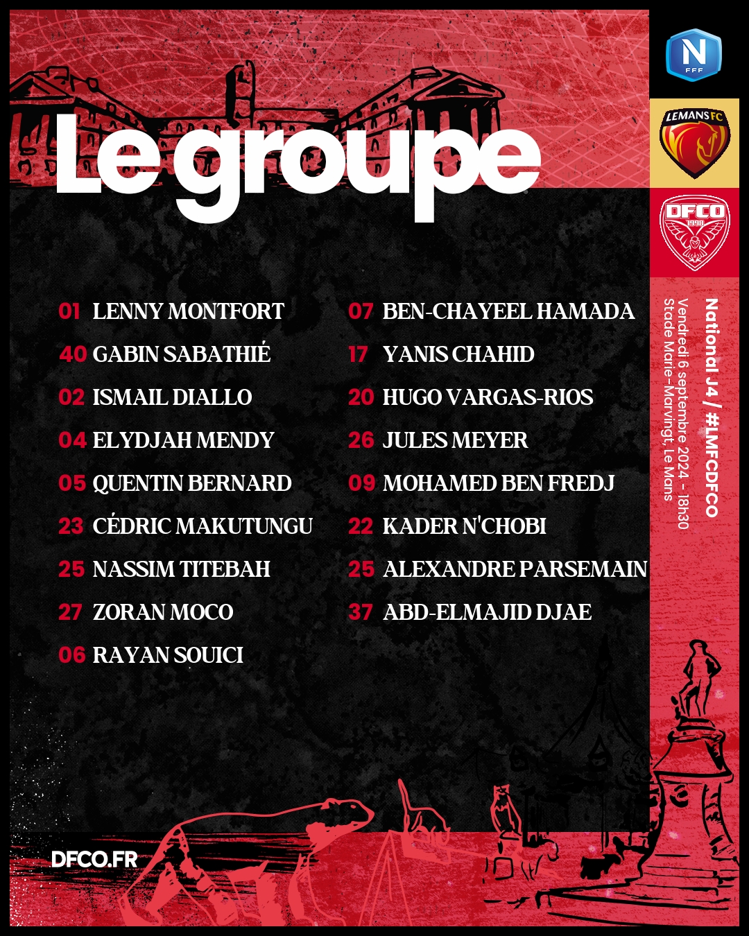 Pour le compte de la 4e journée de National ce vendredi 6 septembre (18h30), le DFCO se déplace sur la pelouse du Mans. Baptiste Ridira et son staff ont convoqué un groupe de 17 joueurs.