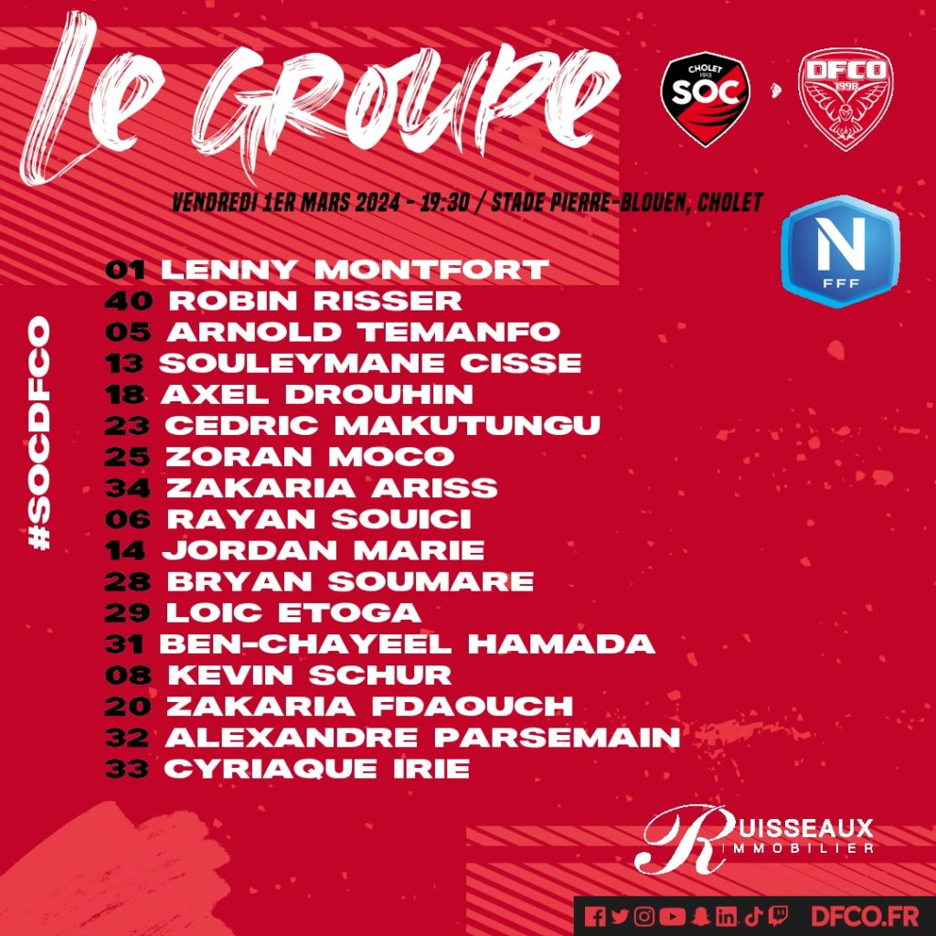 Un groupe de 17 joueurs a été convoqué par Benoît Tavenot et son staff pour affronter le SO Cholet en déplacement ce vendredi 1er mars (19h30) au stade Pierre-Blouen (23e journée de National).