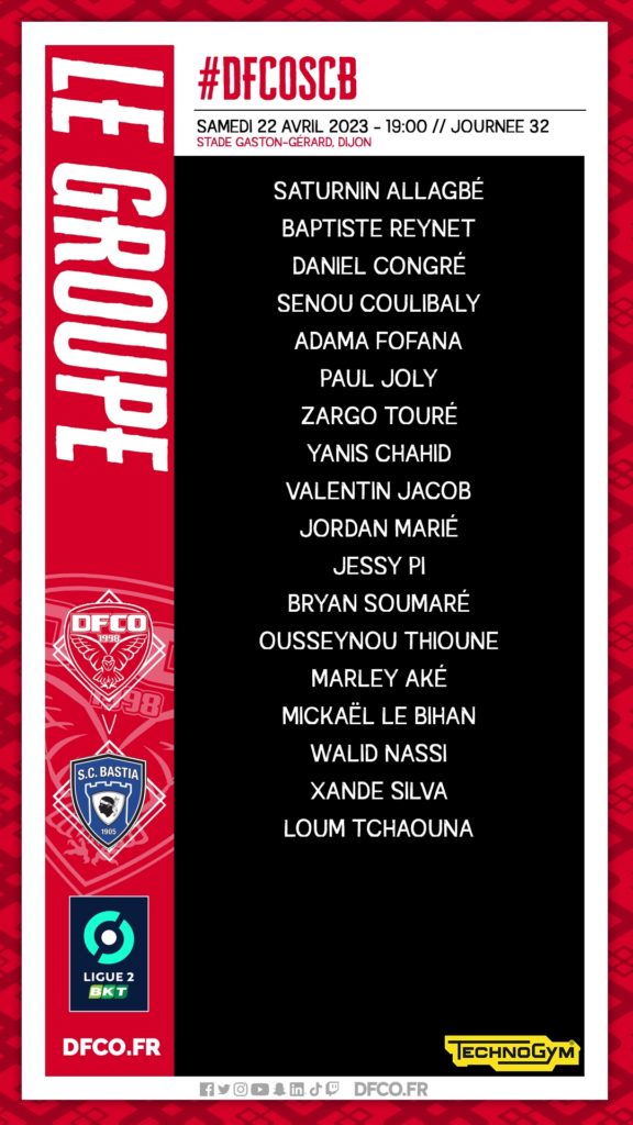Pour la réception du Sporting Club de Bastia (32e journée de Ligue 2 BKT) au stade Gaston-Gérard samedi (19h00), Pascal Dupraz et son staff ont convoqué un groupe de 18 joueurs.