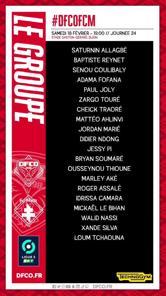 Omar Daf et son staff ont convoqué un groupe de 20 joueurs pour le match DFCO – FC Metz, ce samedi à 19h00 (24e journée de Ligue 2 BKT).