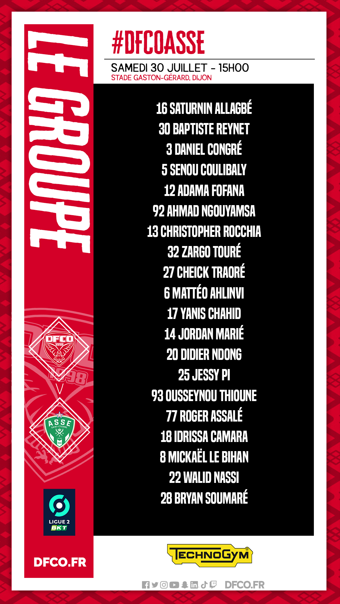 En match d’ouverture de la saison 2022/2023, le DFCO reçoit l’AS Saint-Etienne à Gaston Gérard ce samedi 30 juillet à 15h. Voici le groupe de 20 joueurs composé par Omar Daf et son staff.