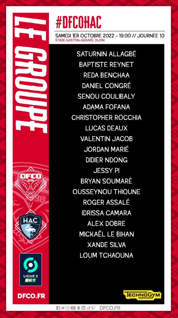 Pour la réception du Havre samedi au stade Gaston-Gérard (19h / 10e journée de Ligue 2 BKT), Omar Daf et son staff ont convoqué 20 joueurs.