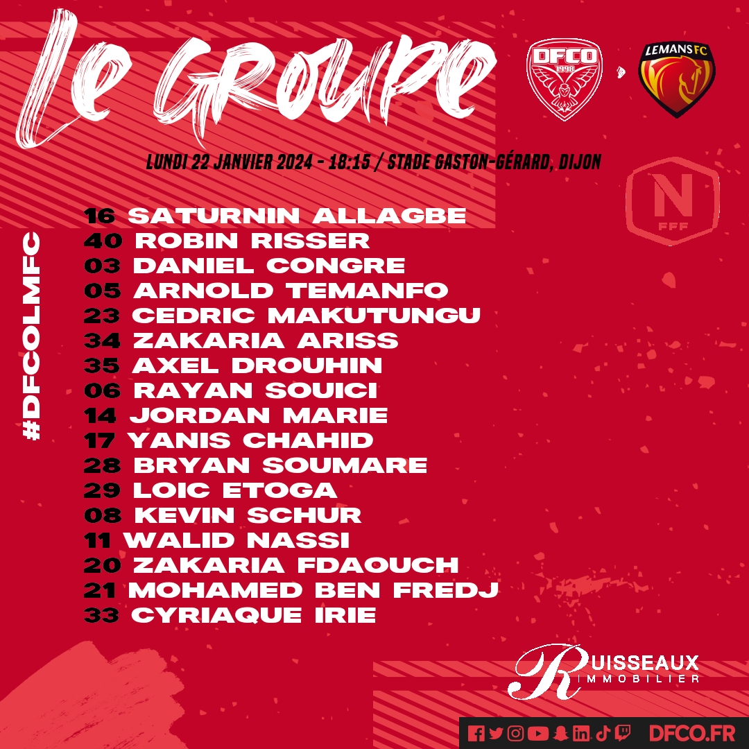 Absents sur blessure la semaine dernière, Loïc Etoga et Arnold Temanfo réintègrent le groupe. Le DFCO sera en revanche toujours privé de Souleymane Cissé, actuellement en phase de reprise.