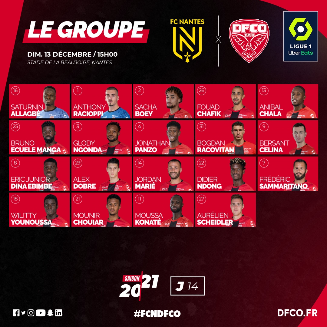 Pour le compte de la 14e journée de Ligue 1 Uber Eats, le DFCO se déplace au stade de la Beaujoire pour affronter le FC Nantes dimanche (15h00). David Linarès et son staff ont convoqué un groupe de 19 joueurs.