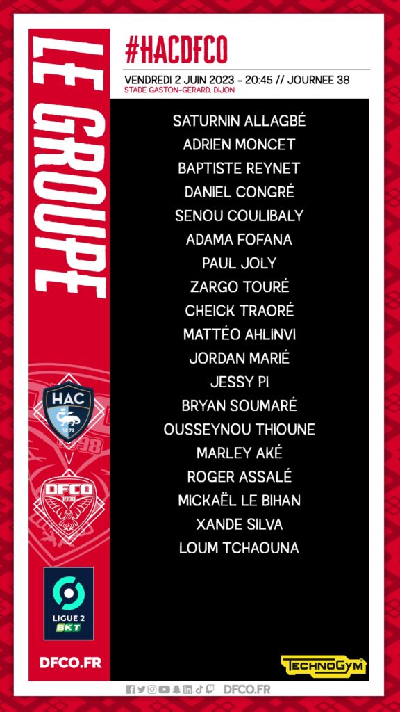Pour cette 38e et dernière journée de Ligue 2 BKT disputée sur la pelouse du Havre (20h45), Pascal Dupraz et son staff ont convoqué un groupe de 19 joueurs.