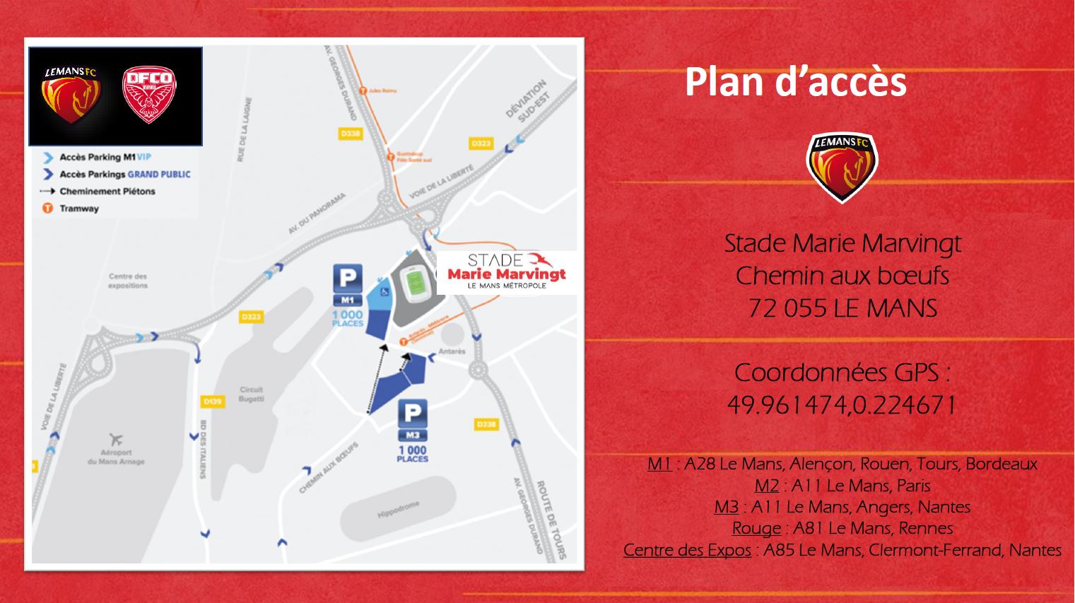 Lundi 21 août (18h30), le DFCO effectuera son premier déplacement de la saison au Mans (stade Marie-Marvingt) pour le compte de la deuxième journée de National. Voici quelques informations pour les supporters dijonnais souhaitant se rendre à ce match.
