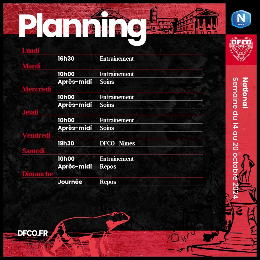 Retour du championnat de National cette semaine avec la réception du Nîmes Olympique vendredi au stade Gaston-Gérard (9e journée / 19h30) ! Découvrez le planning des entraînements cette semaine.