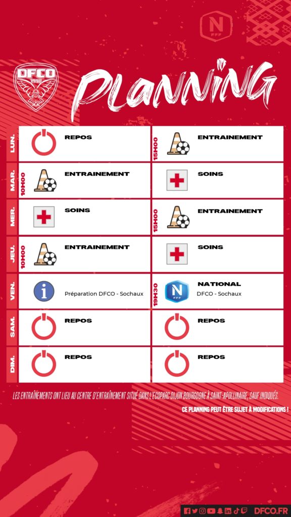 Après son élimination en Coupe de France, le DFCO aura pour objectif de rebondir en championnat en s’imposant face au FC Sochaux-Montbéliard vendredi (19h30 / 16e journée de National). Retrouvez le planning de la semaine.