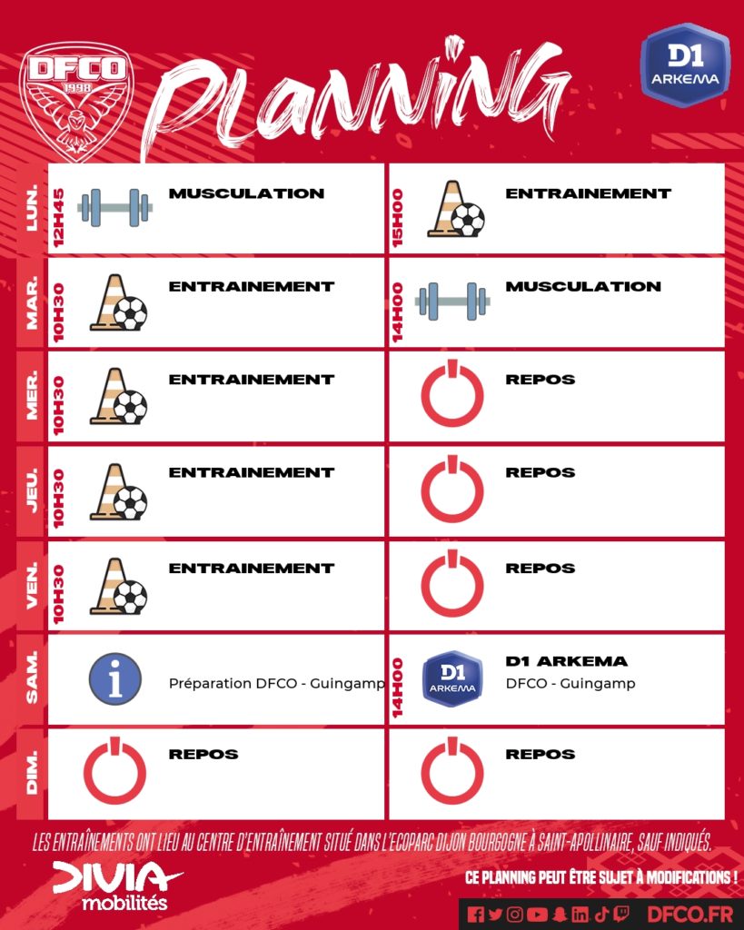Après avoir remporté un brillant succès sur la pelouse des Girondins de Bordeaux, le DFCO va tenter d’enchaîner à domicile contre l’En Avant Guingamp, samedi à 14h00 au stade Gaston-Gérard ! Retrouvez le planning des entraînements collectifs.