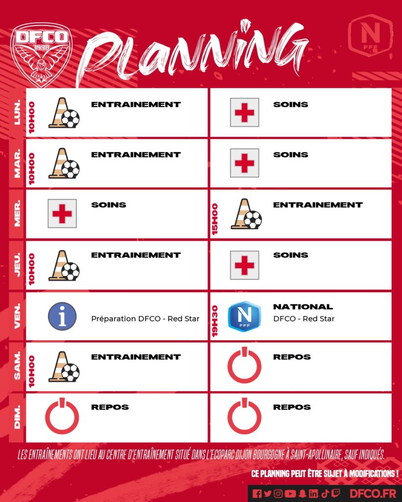 Après la parenthèse Coupe de France à Doullens (0-6), le DFCO aborde une semaine importante en championnat avec la réception du Red Star, leader de National (vendredi 19h30). Les Rouges tenteront d’enchaîner un sixième match consécutif sans défaite. Voici le planning de la semaine.