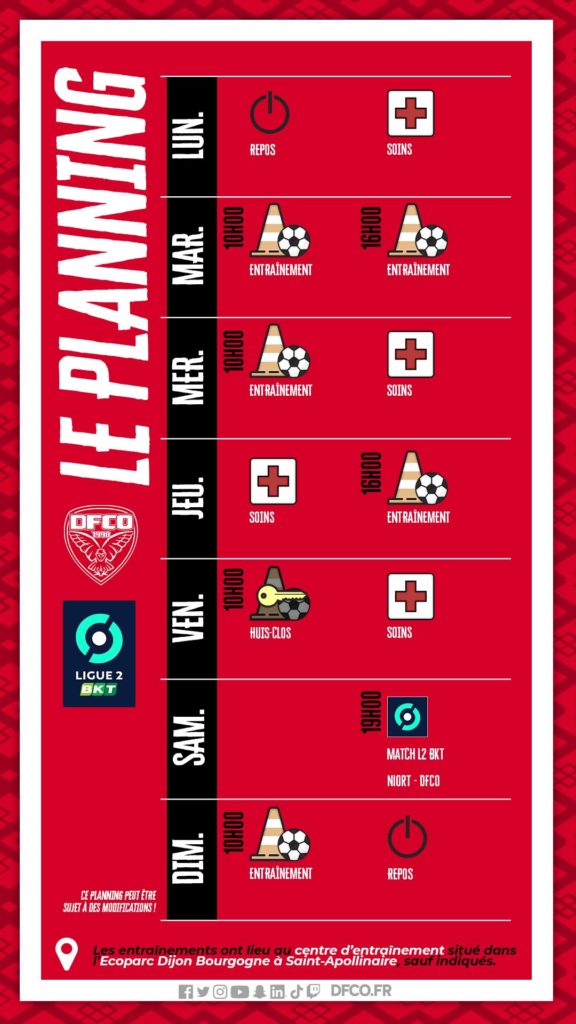 Avant le déplacement à Niort samedi (19h00 / 13e journée de Ligue 2 BKT) au stade René Gaillard, voici le planning de la semaine du groupe professionnel.